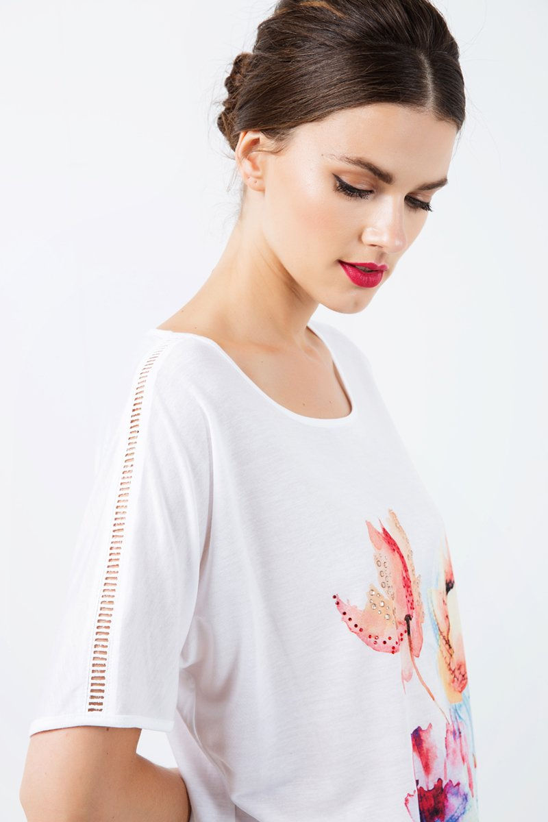 White Jersey Top With Multicoloured Print
